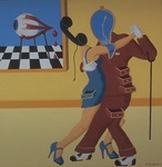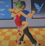 tangodansers in imaginair museum dansend voor of in kunstwerken van diverse grote meesters